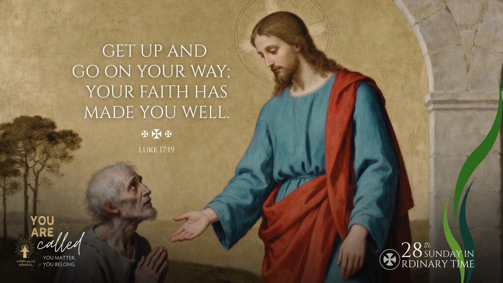 Trên đường lên Giê-ru-sa-lem, Đức Giêsu đi qua biên giới giữa hai miền Sa-ma-ri và Gali-lê. Lúc Người vào một làng kia, thì có mười người phong hủi đón gặp Người. Họ dừng lại đằng xa và kêu lớn tiếng: “Lạy thầy Giê-su, xin dủ lòng thương chúng tôi!” Thấy vậy, Đức Giê-su bảo họ: “Hãy đi trình diện với các tư tế.” Đang khi đi thì họ được sạch. Một người trong bọn, thấy mình được khỏi, liền quay trở lại và lớn tiếng tôn vinh Thiên Chúa. Anh ta sấp mình dưới chân Đức Giê-su mà tạ ơn.